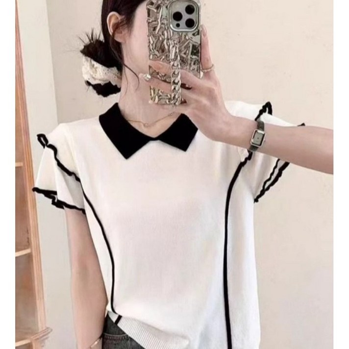 AURALA 여성 여름 반팔니트 카라 티 풀오버 쇼트 니트
