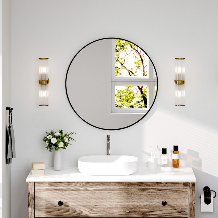USHOWER 블랙 원형 욕실 거울 61cm 벽걸이 화장대 메탈 프레임 모던 인테리어