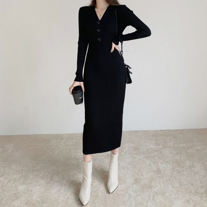 타니즈 헤이넌 버튼 롱 골지 니트 원피스