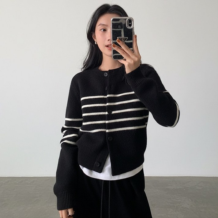 탐리프 여성 스트라이프 라운드 니트 가디건