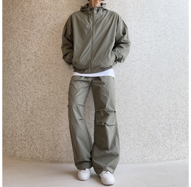 베럴댄나우 남자 오버핏 바람막이 후드집업 무릎 핀턱 와이드 팬츠 상하의 트레이닝 세트