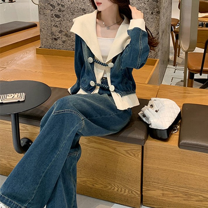 해피유통 여성 봄가을 세트 패션 고급스러운 데님 코트 상의 와이드 팬츠 투피스 whyfxx